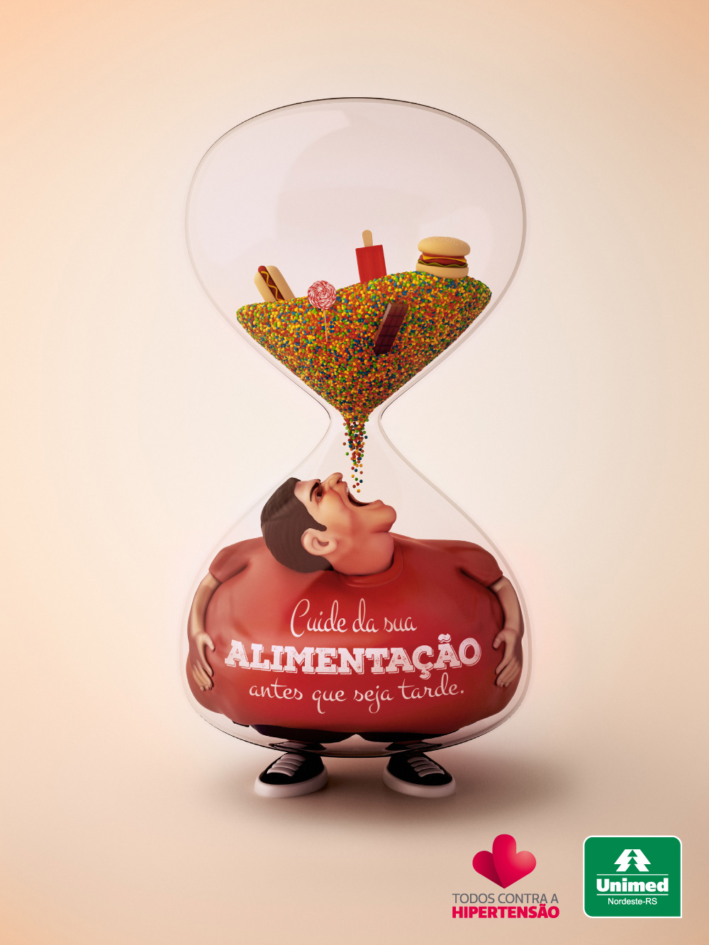Má alimentação, stress e sedentarismo são fatores de risco para a hipertensão, e a Unimed Nordeste/RS buscou fazer um alerta através de uma campanha gráfica.